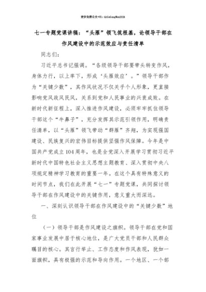 【七哥公文】2025年:【七哥公文】七一专题党课讲稿:“头雁”领飞筑根基,论领导干部在作风建设中的示范效应与责任清单+更多免费公文+VX:QiGeGongWen2024+更多免费公文+VX:QiGeGongWen2024