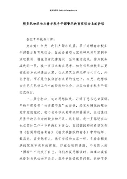 【七哥公文】2025年:【七哥公文】税务纪检组长在青年税务干部警示教育座谈会上的讲话+更多免费公文+VX:QiGeGongWen2024+更多免费公文+VX:QiGeGongWen2024