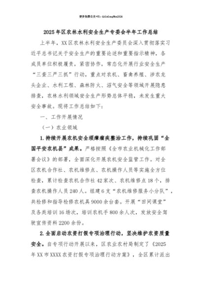 【七哥公文】2025年:【七哥公文】2025年区农林水利安全生产专委会半年工作总结+更多免费公文+VX:QiGeGongWen2024+更多免费公文+VX:QiGeGongWen2024