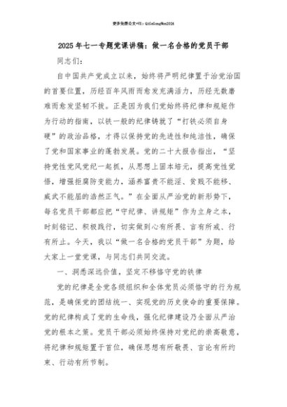 【七哥公文】2025年:【七哥公文】2025年七一专题党课讲稿:做一名合格的党员干部+更多免费公文+VX:QiGeGongWen2024+更多免费公文+VX:QiGeGongWen2024
