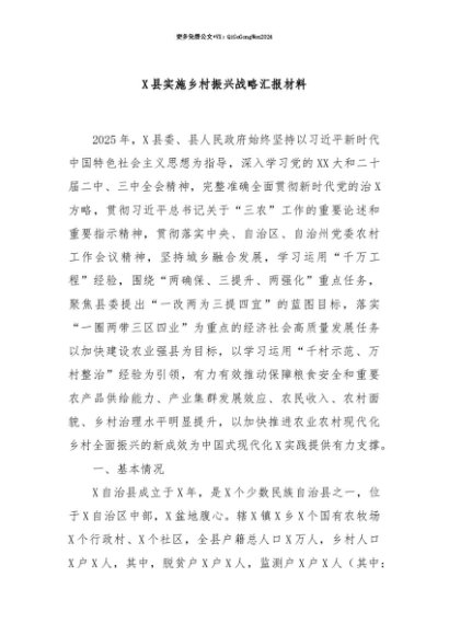 【七哥公文】2025年:【七哥公文】X县实施乡村振兴战略汇报材料+更多免费公文+VX:QiGeGongWen2024+更多免费公文+VX:QiGeGongWen2024