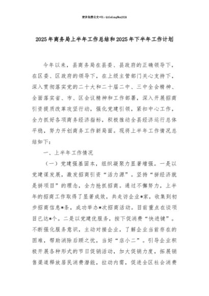 【七哥公文】2025年:【七哥公文】2025年商务局上半年工作总结和2025年下半年工作计划+更多免费公文+VX:QiGeGongWen2024+更多免费公文+VX:QiGeGongWen2024