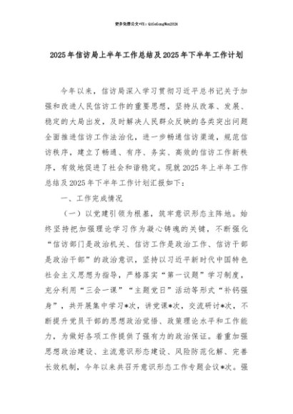 【七哥公文】2025年:【七哥公文】2025年信访局上半年工作总结及2025年下半年工作计划+更多免费公文+VX:QiGeGongWen2024+更多免费公文+VX:QiGeGongWen2024