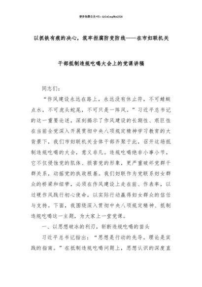 【七哥公文】2025年:【七哥公文】以抓铁有痕的决心,筑牢拒腐防变防线——在市妇联机关干部抵制违规吃喝大会上的党课讲稿+更多免费公文+VX:QiGeGongWen2024+更多免费公文+VX:QiGeGongWen2024