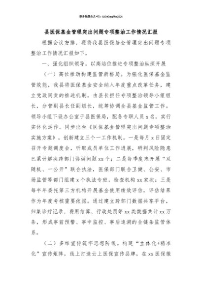 【七哥公文】2025年:【七哥公文】县医保基金管理突出问题专项整治工作情况汇报+更多免费公文+VX:QiGeGongWen2024+更多免费公文+VX:QiGeGongWen2024