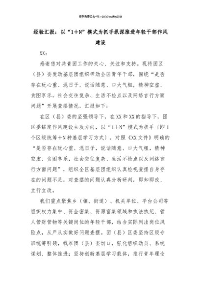 【七哥公文】2025年:【七哥公文】经验汇报:以“1+N”模式为抓手纵深推进年轻干部作风建设+更多免费公文+VX:QiGeGongWen2024+更多免费公文+VX:QiGeGongWen2024