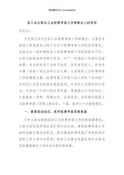 【七哥公文】2025年:【七哥公文】县工会主席在工会经费审查工作部署会上的讲话+更多免费公文+VX:QiGeGongWen2024+更多免费公文+VX:QiGeGongWen2024