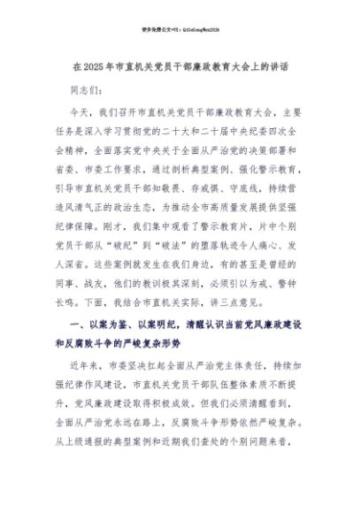 【七哥公文】2025年:【七哥公文】在2025年市直机关党员干部廉政教育大会上的讲话+更多免费公文+VX:QiGeGongWen2024+更多免费公文+VX:QiGeGongWen2024