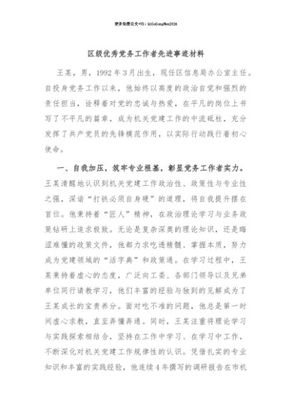 【七哥公文】2025年:【七哥公文】区级优秀党务工作者先进事迹材料+更多免费公文+VX:QiGeGongWen2024+更多免费公文+VX:QiGeGongWen2024