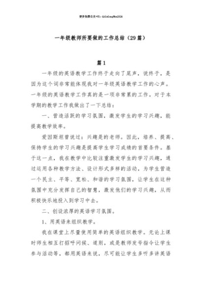【七哥公文】2025年:【七哥公文】(29篇)一年级教师所要做的工作总结+更多免费公文+VX:QiGeGongWen2024+更多免费公文+VX:QiGeGongWen2024