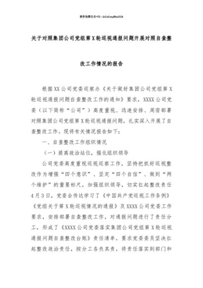 【七哥公文】2025年:【七哥公文】关于对照集团公司党组第X轮巡视通报问题开展对照自查整改工作情况的报告+更多免费公文+VX:QiGeGongWen2024+更多免费公文+VX:QiGeGongWen2024