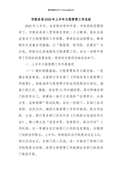【七哥公文】2025年:【七哥公文】市税务局2025年上半年欠税管理工作总结+更多免费公文+VX:QiGeGongWen2024+更多免费公文+VX:QiGeGongWen2024