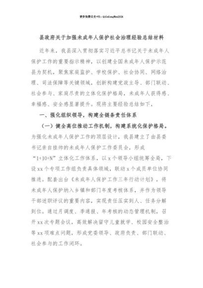 【七哥公文】2025年:【七哥公文】县政府关于加强未成年人保护社会治理经验总结材料+更多免费公文+VX:QiGeGongWen2024+更多免费公文+VX:QiGeGongWen2024