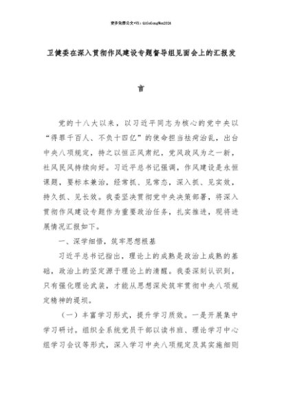 【七哥公文】2025年:【七哥公文】卫健委在深入贯彻作风建设专题督导组见面会上的汇报发言+更多免费公文+VX:QiGeGongWen2024+更多免费公文+VX:QiGeGongWen2024