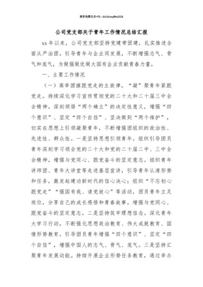 【七哥公文】2025年:【七哥公文】公司党支部关于青年工作情况总结汇报+更多免费公文+VX:QiGeGongWen2024+更多免费公文+VX:QiGeGongWen2024
