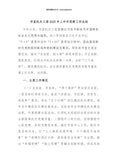 【七哥公文】2025年:【七哥公文】市直机关工委2025年上半年党建工作总结+更多免费公文+VX:QiGeGongWen2024+更多免费公文+VX:QiGeGongWen2024