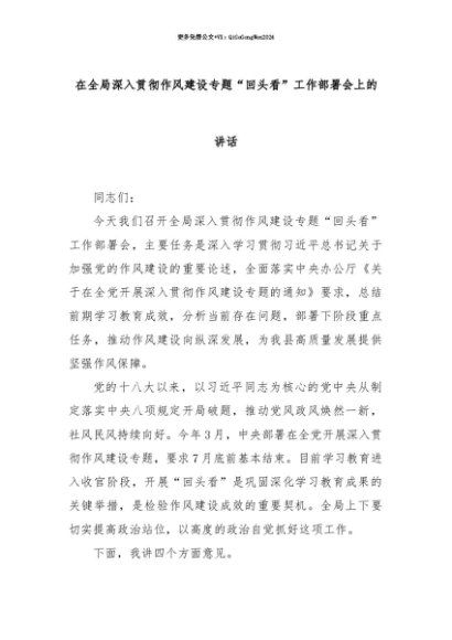 【七哥公文】2025年:【七哥公文】在全局深入贯彻作风建设专题“回头看”工作部署会上的讲话+更多免费公文+VX:QiGeGongWen2024+更多免费公文+VX:QiGeGongWen2024