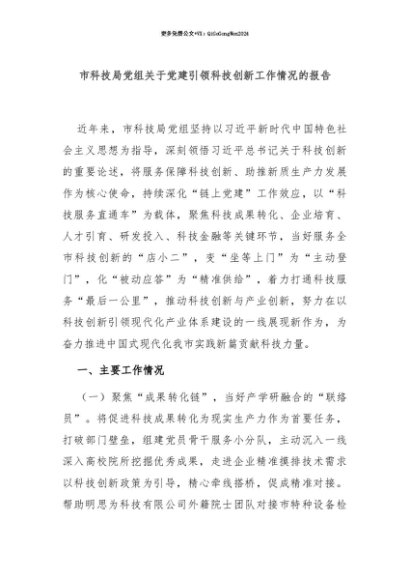 【七哥公文】2025年:【七哥公文】市科技局党组关于党建引领科技创新工作情况的报告+更多免费公文+VX:QiGeGongWen2024+更多免费公文+VX:QiGeGongWen2024