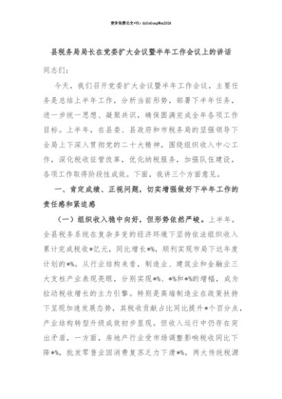 【七哥公文】2025年:【七哥公文】县税务局局长在党委扩大会议暨半年工作会议上的讲话+更多免费公文+VX:QiGeGongWen2024+更多免费公文+VX:QiGeGongWen2024