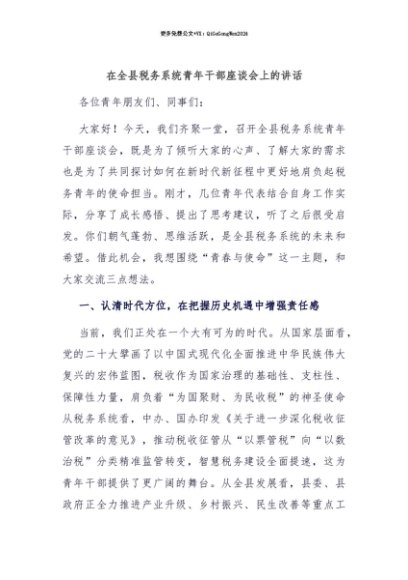 【七哥公文】2025年:【七哥公文】在全县税务系统青年干部座谈会上的讲话+更多免费公文+VX:QiGeGongWen2024+更多免费公文+VX:QiGeGongWen2024