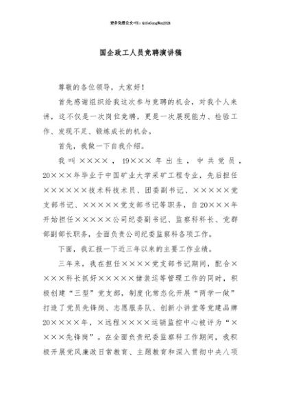 【七哥公文】2025年:【七哥公文】国企政工人员竞聘演讲稿+更多免费公文+VX:QiGeGongWen2024+更多免费公文+VX:QiGeGongWen2024