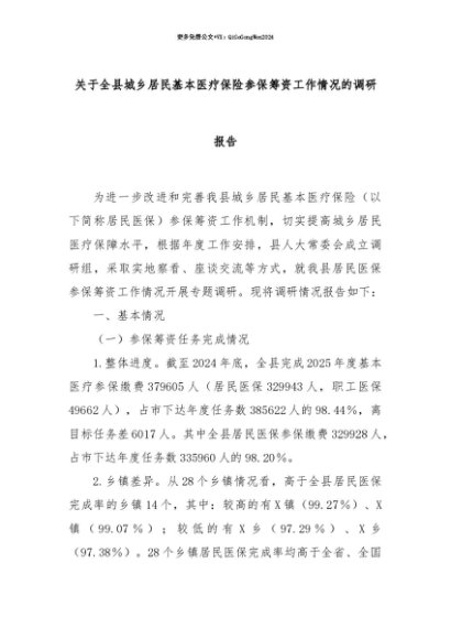 【七哥公文】2025年:【七哥公文】关于全县城乡居民基本医疗保险参保筹资工作情况的调研报告+更多免费公文+VX:QiGeGongWen2024+更多免费公文+VX:QiGeGongWen2024
