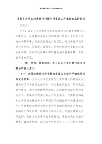 【七哥公文】2025年:【七哥公文】县税务局长在纪律作风问题专项整治工作推进会上的讲话+更多免费公文+VX:QiGeGongWen2024+更多免费公文+VX:QiGeGongWen2024