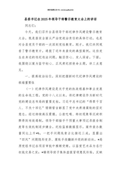 【七哥公文】2025年:【七哥公文】县委书记在2025年领导干部警示教育大会上的讲话+更多免费公文+VX:QiGeGongWen2024+更多免费公文+VX:QiGeGongWen2024