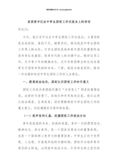 【七哥公文】2025年:【七哥公文】县团委书记在中学生团校工作交流会上的讲话+更多免费公文+VX:QiGeGongWen2024+更多免费公文+VX:QiGeGongWen2024