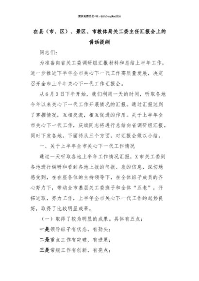 【七哥公文】2025年:【七哥公文】在县(市、区)、景区、市教体局关工委主任汇报会上的讲话提纲+更多免费公文+VX:QiGeGongWen2024+更多免费公文+VX:QiGeGongWen2024