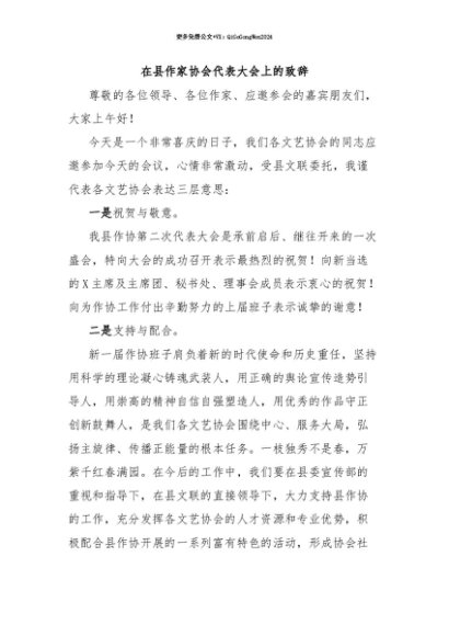 【七哥公文】2025年:【七哥公文】在县作家协会代表大会上的致辞+更多免费公文+VX:QiGeGongWen2024+更多免费公文+VX:QiGeGongWen2024