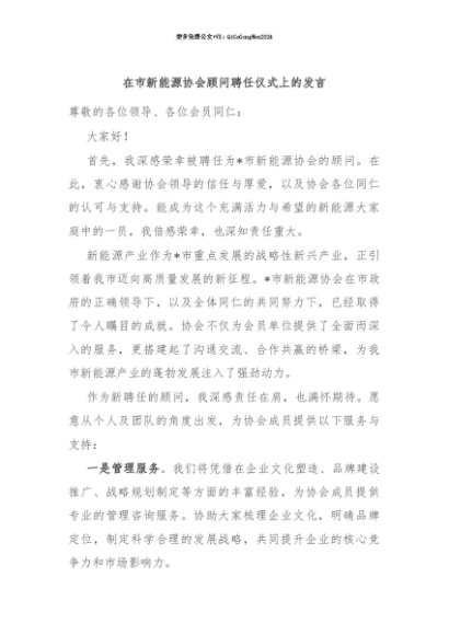 【七哥公文】2025年:【七哥公文】在市新能源协会顾问聘任仪式上的发言+更多免费公文+VX:QiGeGongWen2024+更多免费公文+VX:QiGeGongWen2024