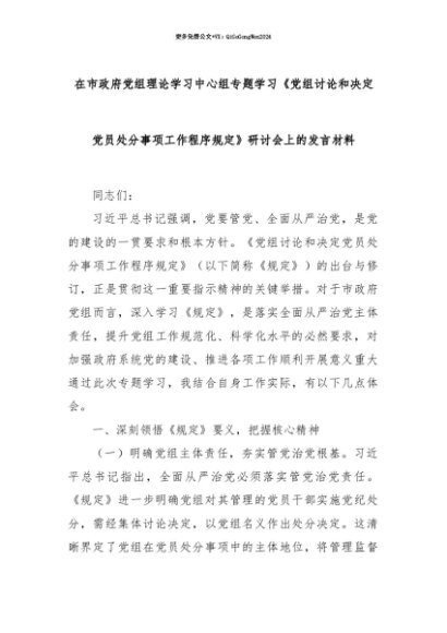 【七哥公文】2025年:【七哥公文】在市政府党组理论学习中心组专题学习《党组讨论和决定党员处分事项工作程序规定》研讨会上的发言材料+更多免费公文+VX:QiGeGongWen2024+更多免费公文+VX:QiGeGongWen2024