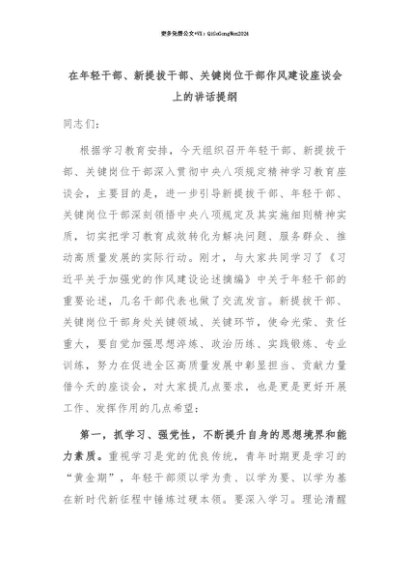 【七哥公文】2025年:【七哥公文】在年轻干部、新提拔干部、关键岗位干部作风建设座谈会上的讲话提纲+更多免费公文+VX:QiGeGongWen2024+更多免费公文+VX:QiGeGongWen2024