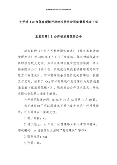 【七哥公文】2025年:【七哥公文】关于对《xx市体育领域行政违法行为处罚裁量基准表(征求意见稿)》公开征求意见的公告+更多免费公文+VX:QiGeGongWen2024+更多免费公文+VX:QiGeGongWen2024