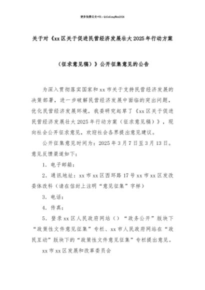 【七哥公文】2025年:【七哥公文】关于对《xx区关于促进民营经济发展壮大2025年行动方案(征求意见稿)》公开征集意见的公告+更多免费公文+VX:QiGeGongWen2024+更多免费公文+VX:QiGeGongWen2024