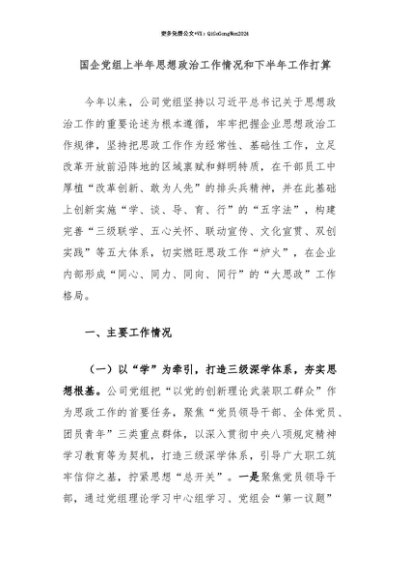 【七哥公文】2025年:【七哥公文】国企党组上半年思想政治工作情况和下半年工作打算+更多免费公文+VX:QiGeGongWen2024+更多免费公文+VX:QiGeGongWen2024