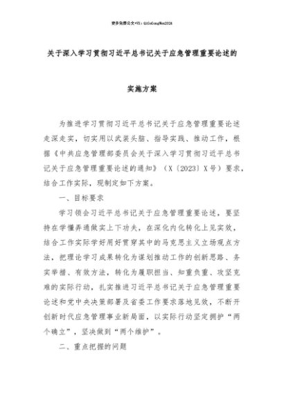 【七哥公文】2025年:【七哥公文】关于深入学习贯彻习近平总书记关于应急管理重要论述的实施方案+更多免费公文+VX:QiGeGongWen2024+更多免费公文+VX:QiGeGongWen2024