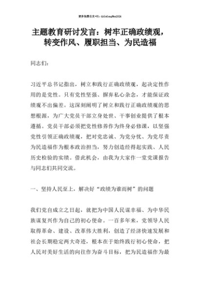 【七哥公文】2025年:【七哥公文】主题教育研讨发言:树牢正确政绩观,转变作风、履职担当、为民造福+更多免费公文+VX:QiGeGongWen2024+更多免费公文+VX:QiGeGongWen2024