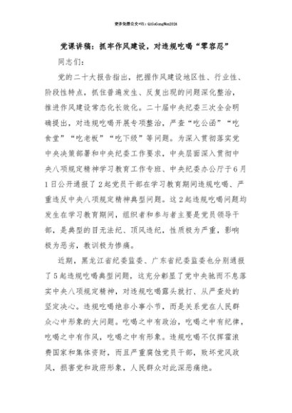 【七哥公文】2025年:【七哥公文】党课讲稿:抓牢作风建设,对违规吃喝“零容忍”+更多免费公文+VX:QiGeGongWen2024+更多免费公文+VX:QiGeGongWen2024