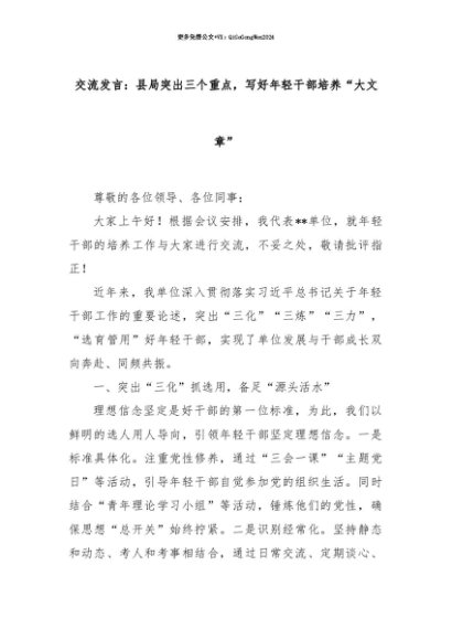 【七哥公文】2025年:【七哥公文】交流发言:县局突出三个重点,写好年轻干部培养“大文章”+更多免费公文+VX:QiGeGongWen2024+更多免费公文+VX:QiGeGongWen2024