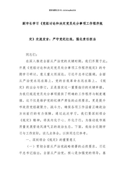 【七哥公文】2025年:【七哥公文】副市长学习《党组讨论和决定党员处分事项工作程序规定》交流发言:严守党纪红线,强化责任担当+更多免费公文+VX:QiGeGongWen2024+更多免费公文+VX:QiGeGongWen2024