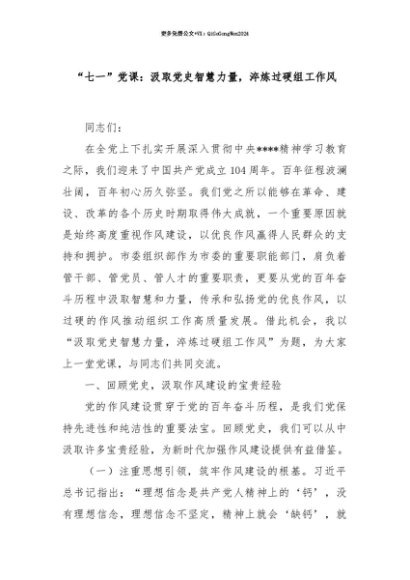 【七哥公文】2025年:【七哥公文】“七一”党课:汲取党史智慧力量,淬炼过硬组工作风+更多免费公文+VX:QiGeGongWen2024+更多免费公文+VX:QiGeGongWen2024