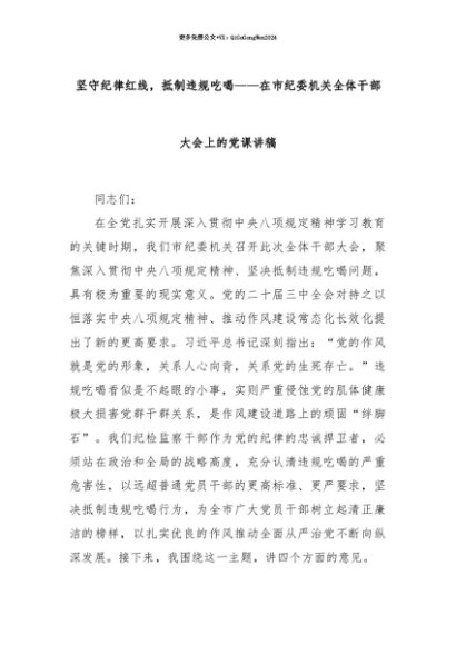 【七哥公文】2025年:【七哥公文】坚守纪律红线,抵制违规吃喝——在市纪委机关全体干部大会上的党课讲稿+更多免费公文+VX:QiGeGongWen2024+更多免费公文+VX:QiGeGongWen2024