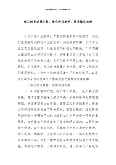 【七哥公文】2025年:【七哥公文】学习教育进展汇报:强化作风建设,提升编办效能+更多免费公文+VX:QiGeGongWen2024+更多免费公文+VX:QiGeGongWen2024