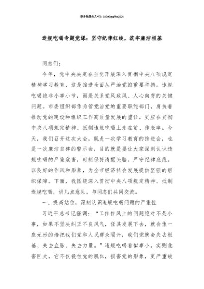 【七哥公文】2025年:【七哥公文】违规吃喝专题党课:坚守纪律红线,筑牢廉洁根基+更多免费公文+VX:QiGeGongWen2024+更多免费公文+VX:QiGeGongWen2024