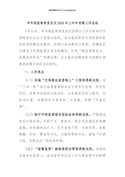 【七哥公文】2025年:【七哥公文】市市场监管局党总支2025年上半年党建工作总结+更多免费公文+VX:QiGeGongWen2024+更多免费公文+VX:QiGeGongWen2024