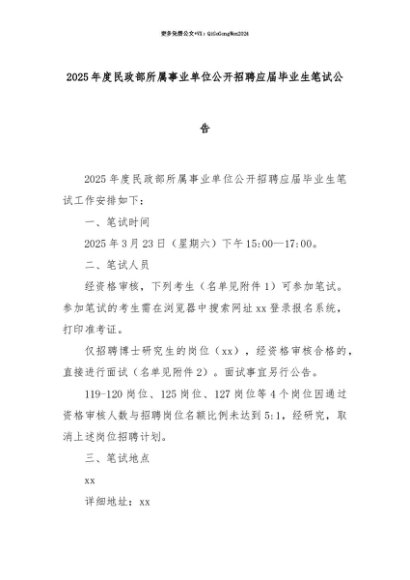 【七哥公文】2025年:【七哥公文】2025年度民政部所属事业单位公开招聘应届毕业生笔试公告+更多免费公文+VX:QiGeGongWen2024+更多免费公文+VX:QiGeGongWen2024