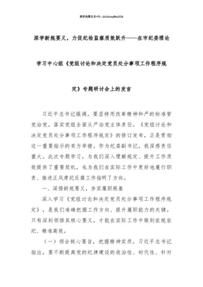 【七哥公文】2025年:【七哥公文】深学新规要义,力促纪检监察质效跃升——在市纪委理论学习中心组《党组讨论和决定党员处分事项工作程序规定》专题研讨会上的发言+更多免费公文+VX:QiGeGongWen2024+更多免费公文+VX:QiGeGongWen2024