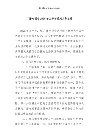 【七哥公文】2025年:【七哥公文】广播电视台2025年上半年党建工作总结+更多免费公文+VX:QiGeGongWen2024+更多免费公文+VX:QiGeGongWen2024